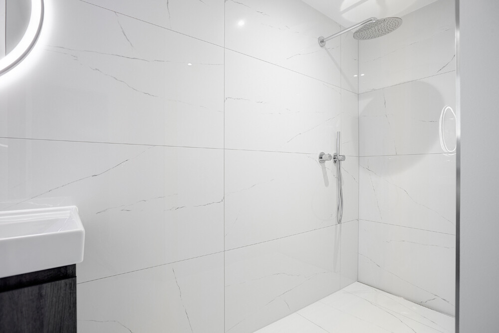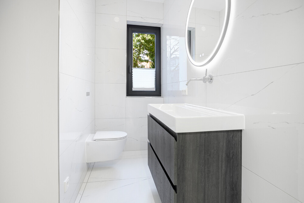 - Bäder in Feinsteinmarmor, Armaturen von Dornbracht und Keuco, beheizte Spiegel mit dimmbarer Beleuchtung