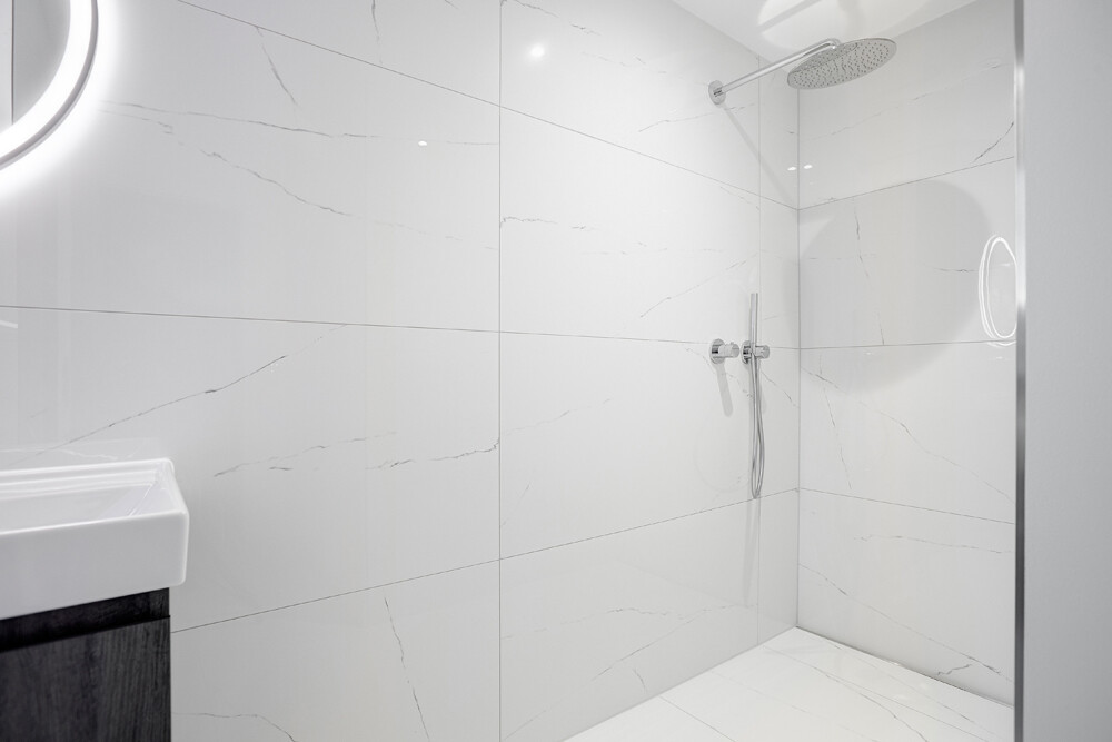 - Bäder in Feinsteinmarmor, Armaturen von Dornbracht und Keuco, beheizte Spiegel mit dimmbarer Beleuchtung